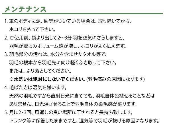 fk094igrjs 柔らかい羽根を厳選して使用していますので、車の塗装面にもご使用いただける毛ばたきです。2本使用し、とれたホコリをたたいて落としながら使うと効果的です。羽根の量が多く、耐久性に優れています。車のホコリ払いに最適なアイテムです。※こちらの商品は配送先によってお届けの際の着日・時間指定はできかねます。あらかじめご了承ください。※土日祝の配送に関して:日時指定はお受けできますが、配送時間の指定は対応いたしかねます。あらかじめご了承ください。サイズ全長1100mm、羽根付650mm、グリップ長250mm個装サイズ:130×15×13cm重量個装重量:930g素材・材質羽毛:ニワトリ生産国日本 ※お客さま都合による、ご注文後の[キャンセル][変更][返品][交換]はお受けできませんのでご注意下さいませ。※当店では、すべての商品で在庫を持っておりません。記載の納期を必ずご確認ください。※ご注文いただいた場合でもメーカーの[在庫切れ][欠品][廃盤]などの理由で、[記載の納期より発送が遅れる][発送できない]場合がございます。その際は、当店よりご連絡させていただきます。あらかじめご了承ください。※こちらの商品は【他商品との同梱】ができません。※こちらの商品は【ギフトサービス】をお受けすることができません。